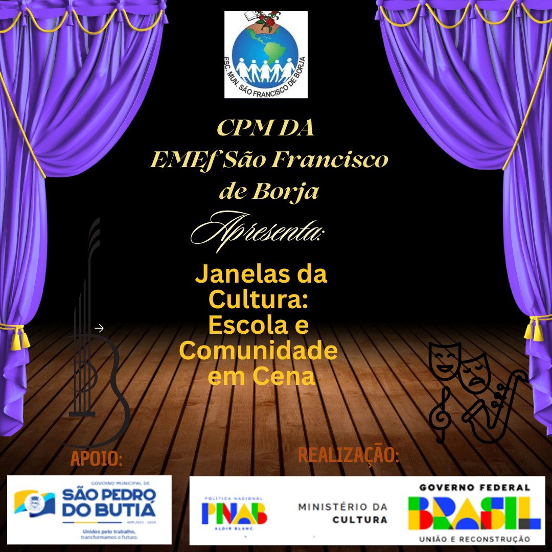 A Escola Municipal São Francisco de Borja tem a alegria de compartilhar uma grande conquista! Fomos contemplados pelo Ministério da Cultura do Governo Federal com o projeto “Janelas da Cultura: Escola e Comunidade em Cena”, uma iniciativa que tem como propósito fortalecer os vínculos entre a escola e a comunidade, promovendo a integração por meio de ações culturais que envolvem nossos estudantes em vivências artísticas significativas.